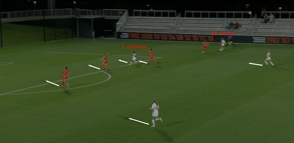 The pass finds Brown in space, and striker Laken Gallman ‘24 makes a run in behind which drags two defenders out of the way, leaving Brown in a one-on-one where she has a step on her defender.